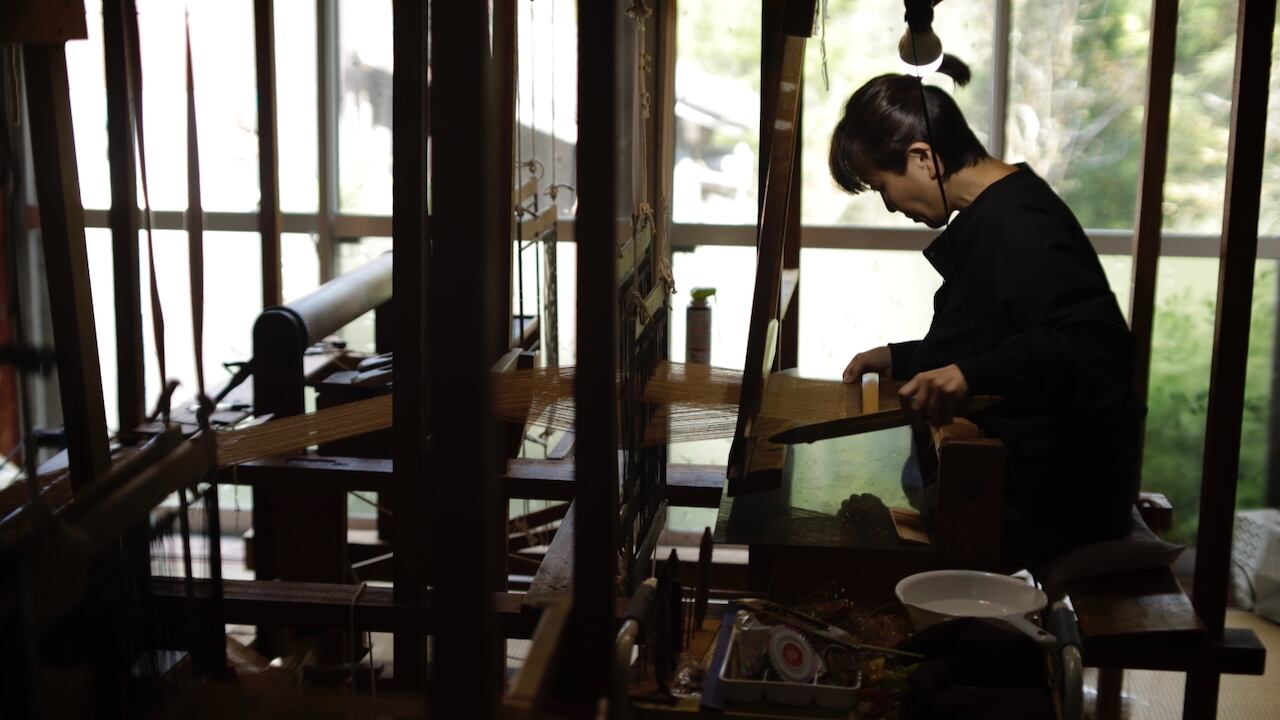 それを指の爪で細く裂き、特殊な手技で一本の糸に繋ぎ合わせ、糸車で捻りを掛けてから手機で織り上げるという、